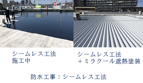 소중한 건물을 방수 보증 최장 20년에 지키는 고강도 밀착 도막 방수 공사.강도, 내구성, 내마모성이 매우 높은 도막 방수를 이음새 없이 지붕 등에 밀착시킵니다. 등으로 지붕재가 파단해도 끊어지기 어려운 강인한 방수 도막입니다.방수의 외, 건물의 열화, 붕락 대책에도 효과를 발휘합니다. 톱 코트를 차열 도료 미라쿠르로 마무리하면, 실온을 효과적으로 낮추고, 실온 관리가 용이하게 됩니다.공조 전력 소비량의 삭감으로 탈탄소 경영에 기여합니다.