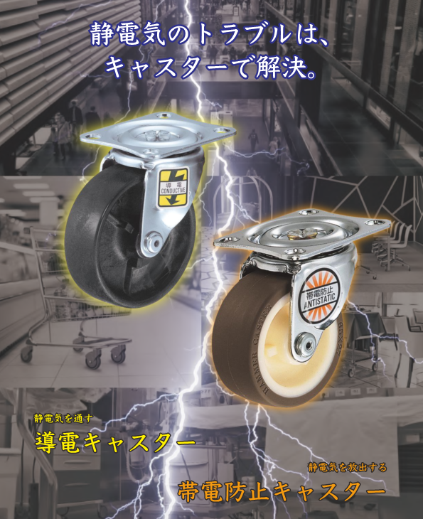 도전 캐스터·대전 방지 캐스터를 사용하는 것으로, 비용이나 시간을 들이지 않고, 간단하게 정전기 대책을 할 수 있습니다