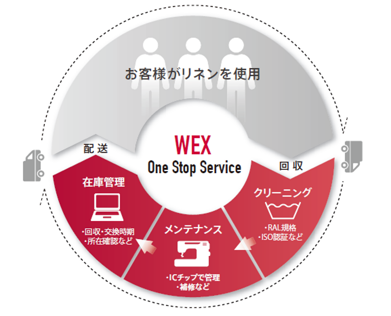 「유니폼 렌탈 서비스」란 섬유 제품을 고객에게 렌탈을 하고, 이용 후의 섬유 제품을 「회수・세탁・마무리・멘테넌스」를 실시해, 다시 고객에게 「납품」을 해, 이용해 주시는 서비스입니다.