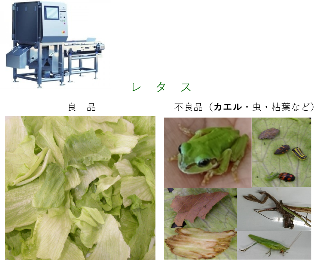 - 또, 다른 파장역을 사용하면, 제품과 동색의 이물, 예를 들면 컷 야채 중에서【개구리】등을 검출·배제할 수 있습니다.