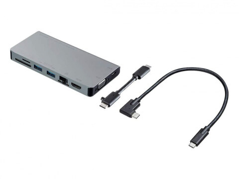 USB Type-C 접속의 소형 도킹 스테이션(Thunderbolt 3은 비대응). 아날로그 디스플레이를 접속할 수 있는 VGA 포트를 비롯해, 전부 들어가라고 해도 좋을 만큼 포트의 종류는 풍부하고, 한편 USB Standard A도 3 포트로 많다. 본체 직접 부착의 케이블은 수납 가능.