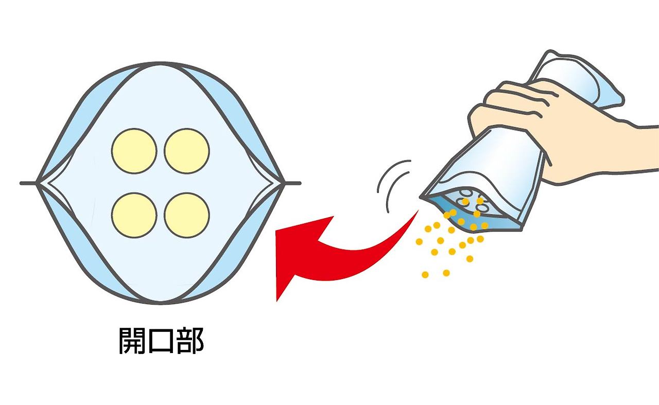 뿌려나 향신료 등 가루, 알갱이의 내용물을 빨리 적당량을 꺼낼 수 있는 특수 패키지!