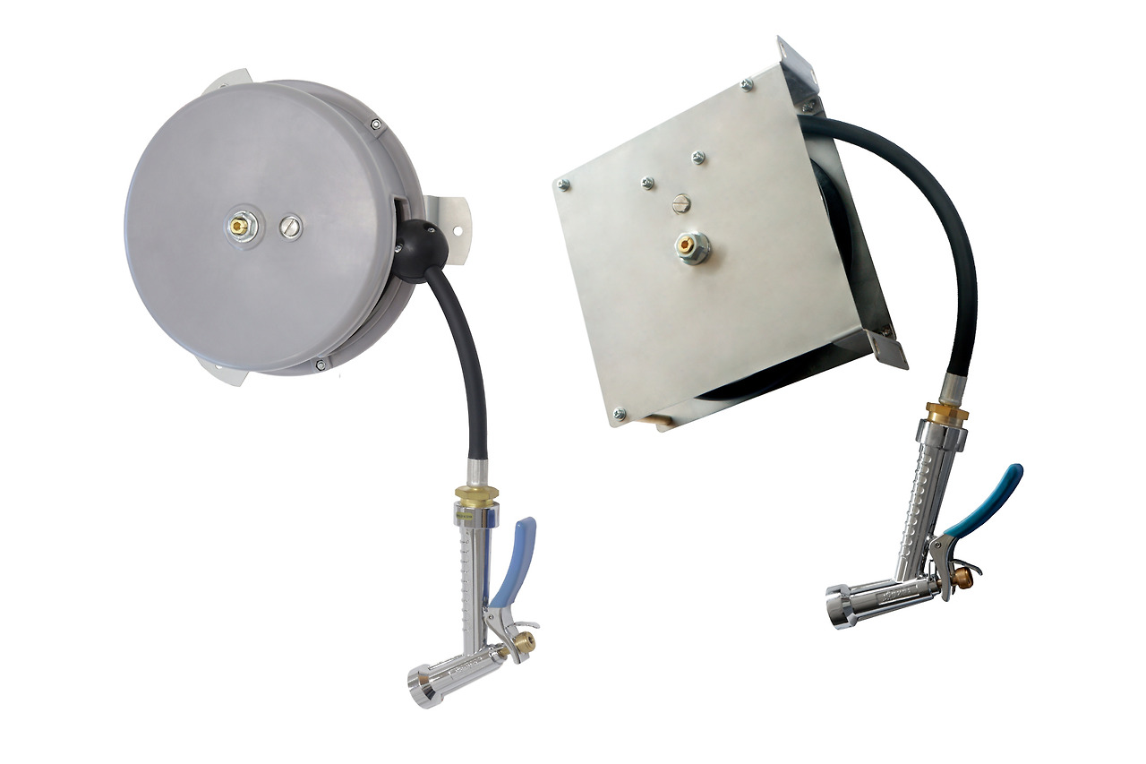 스티콘용의 세정 호스는 자동 감기로 수납 가능하고, 호스가 바닥에 닿지 않기 때문에 안심・안전・위생적입니다.