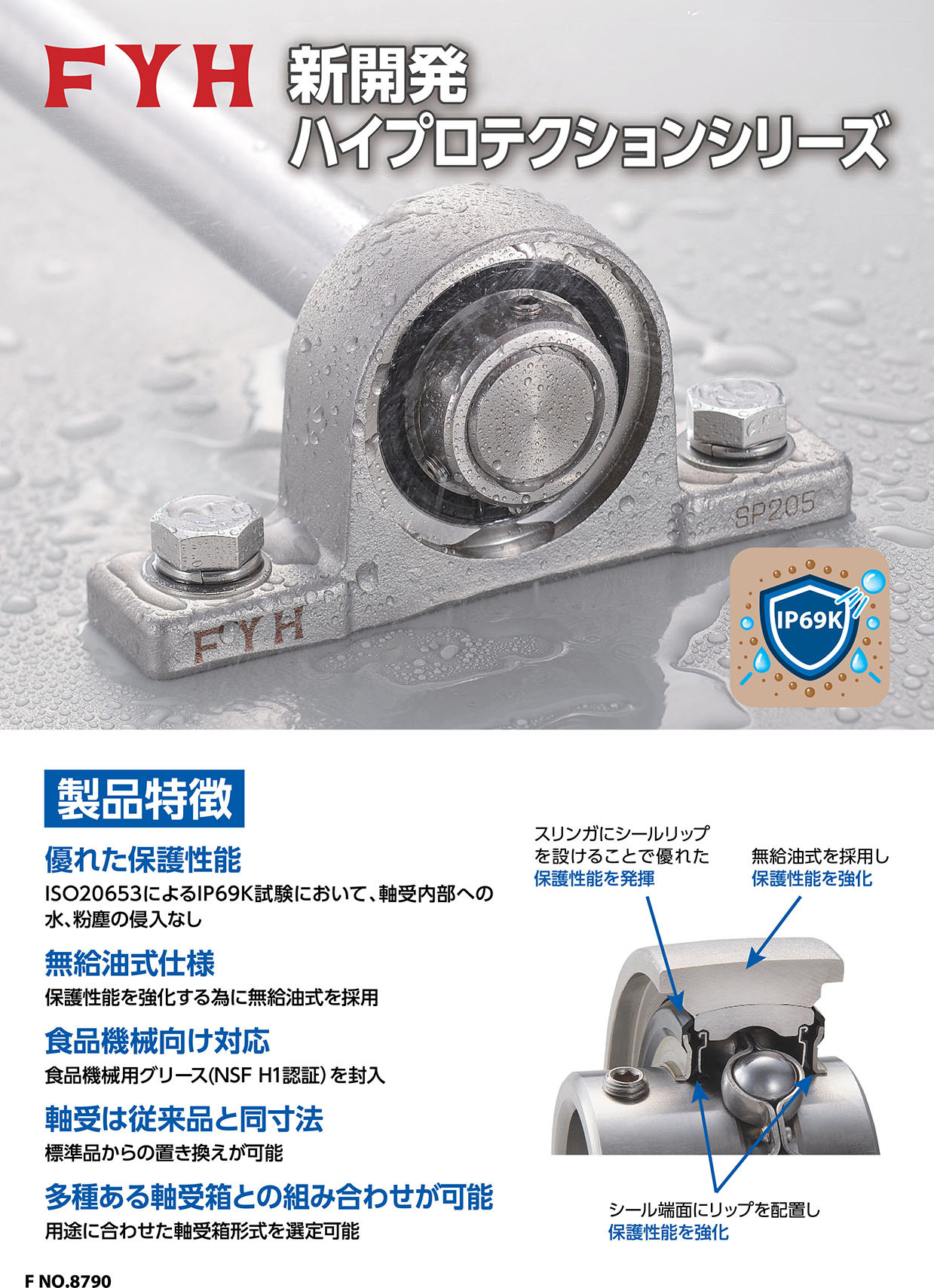 IP69K 규격에 준거한 스테인리스제 베어링 유닛.