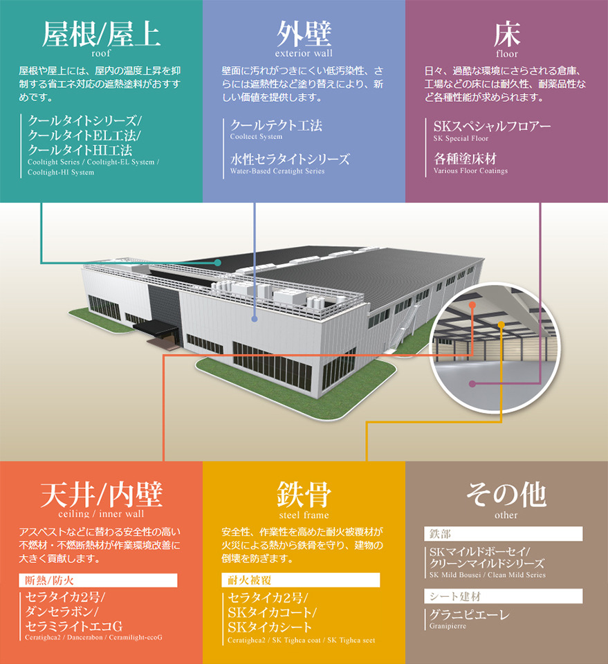 - ④내벽, 천장;공장이나 사무소의 내벽, 천장에는, 항균성, 방곰팡이·방조성, 닦아내기성 등이 뛰어난 고기능형 에멀젼 페인트가 추천입니다