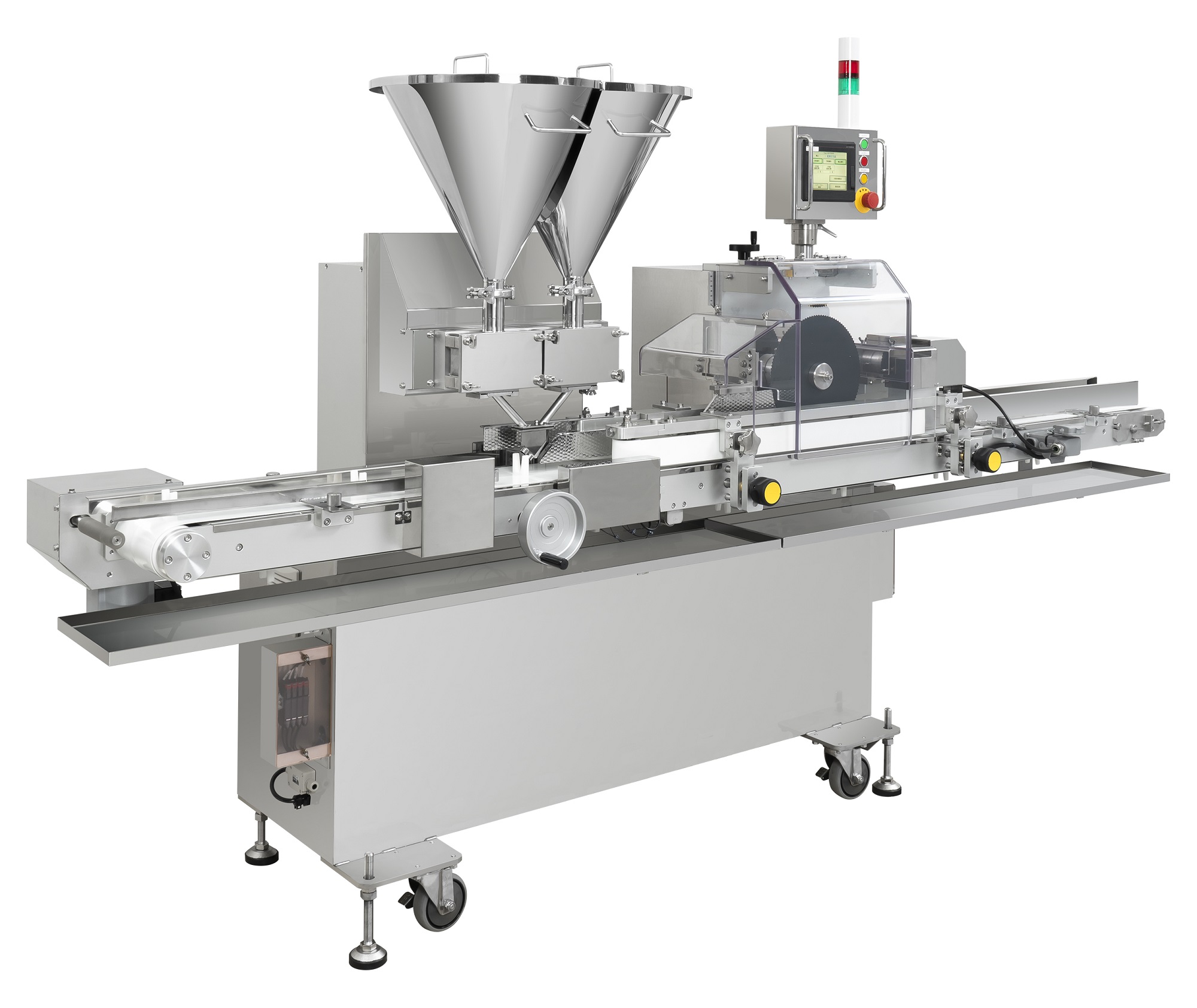 이 자동화 장치는 롤빵과 코페빵을 등분할 또는 배분할 방식으로 정확하게 절단하고, 2개의 충전부를 통해 2가지 종류의 필링을 동시에 충전할 수 있습니다. 충전 노즐을 교체하면 상하 2색, 좌우 2색, 전후 2색 충전도 가능하여 다양한 색상과 맛의 빵을 생산할 수 있습니다. 또한, 제품 사이드 이송 컨베이어 장치를 사용하여 안정적인 제품 생산을 보장하며, 계란 필링과 같이 고형물이 포함된 필링도 문제없이 충전할 수 있습니다. 빵의 크기에 맞춰 기계를 맞춤형으로 설계할 수 있어 최적의 생산 환경을 구축할 수 있습니다.