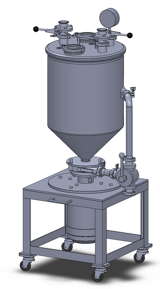 100L에 못 미치는 소 로트 제품이나 부원료의 혼합·용해 등에 적합한 장치입니다. 호퍼 바로 아래에 용해기를 설치하여 순환시켜 용해 혼합을 실시합니다.