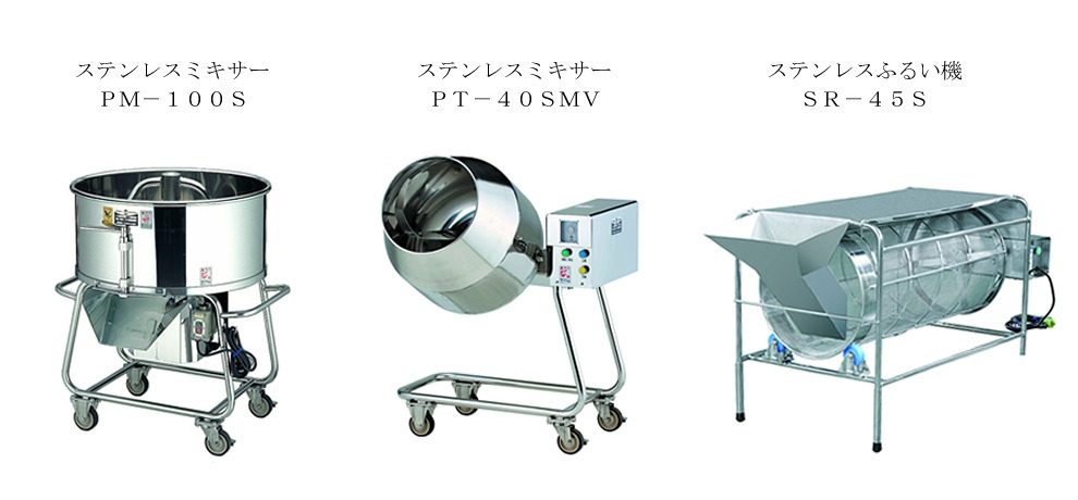 PM시리즈는, 힘 강하게 혼합하는 대용량의 팬형 스테인리스 믹서입니다.공간 절약으로 대량 혼합이 가능하고, 드럼내의 하네는 교환하기 쉽고 손쉽게 손질을 할 수 있습니다