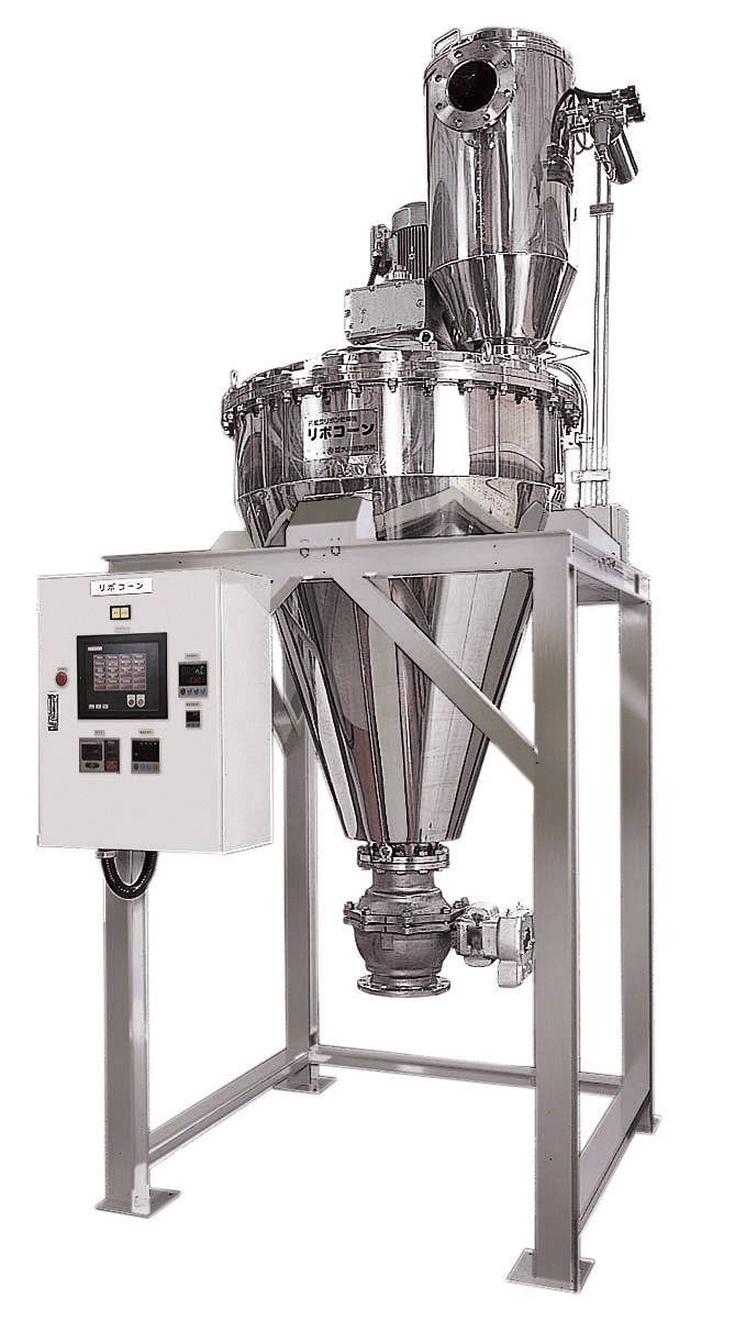 리보콘은, 추형, 역원추형 용기에, 우수한 혼합 성능을 가지는, 나선 리본 회전날개를 수납한 배치 타입의 분립체 혼합기입니다.