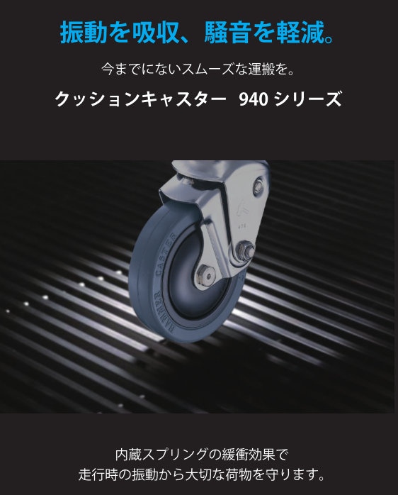 진동이나 충격을 흡수해 소중한 짐을 파손으로부터 지키는 쿠션 캐스터 940 시리즈.