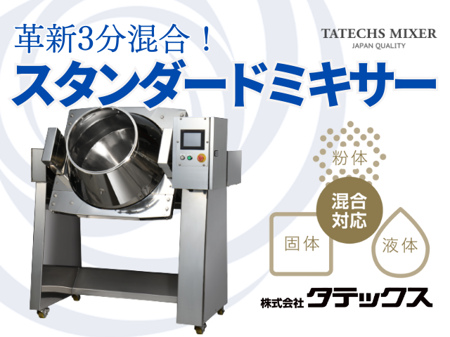 타텍스 믹서는, 드럼의 회전·속도·기울기 등의 운전 조건을, 원료의 투입량이나, 목적에 맞추어 터치 패널상에서 조정하는 일로, 비중차가 큰 원료의 혼합·미량 성분의 분산·입도차에 의한 분리의 억제·데미지가 적은 소프트 혼합 등, 폭넓은 상품에 대응