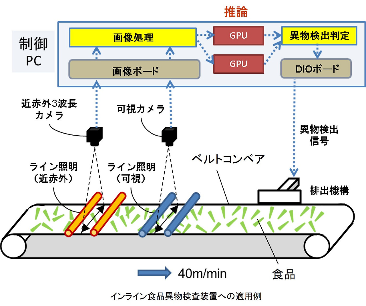 2종류의 카메라(NIR카메라, 칼라 카메라)를 이용한 검사와 각 카메라의 AI(딥 러닝) 검사에 의한 총 4종류의 로직으로 종래에서는 판정 곤란한 이물질을 검출합니다.