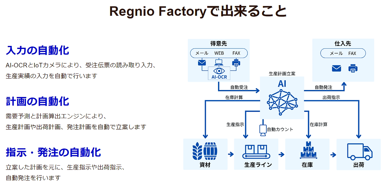 Regnio Factory는 자재원재료관리에서 출하관리까지 생산 공급체인 전체의 정보를 일기통관으로 연결하여 AI기술에 의해 주요한 관리업무를 자동화/반자동화하는 서비스입니다