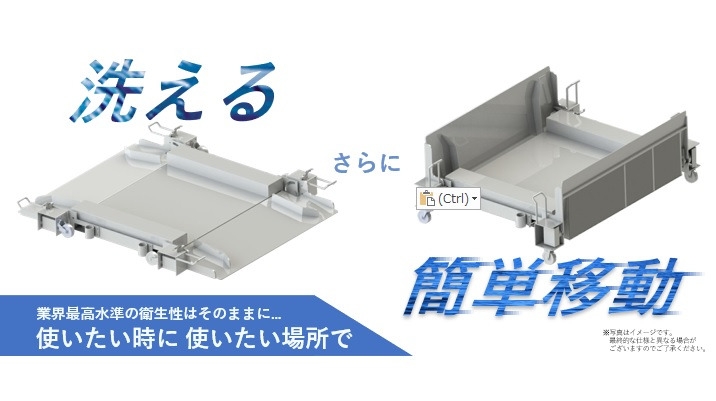 업계 최고 수준의 위생성은 그대로 『사용하고 싶을 때, 사용하고 싶은 장소에서』의 사용이 가능해졌습니다.배터리 옵션을 탑재하면 전원이 근처에 없는 장소에서도 이용하실 수 있습니다. 능한 방수성과 세정하기 쉬운 구조에 특화하고 있어 식의 안전·안심의 리스크를 저감.또, 초저상으로 하카리에 실어 내리는 수작업의 경감과 대차로의 실내 내림의 작업 부담을 경감해, 현장의 일 용이성과 안전성에 공헌합니다.